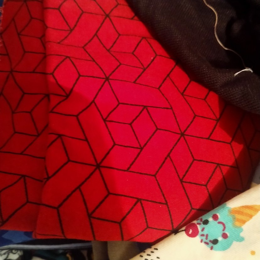 Koyu kırmızı renkte, geometrik desenli ve yumuşak dokulu bir penye metre 30 tl