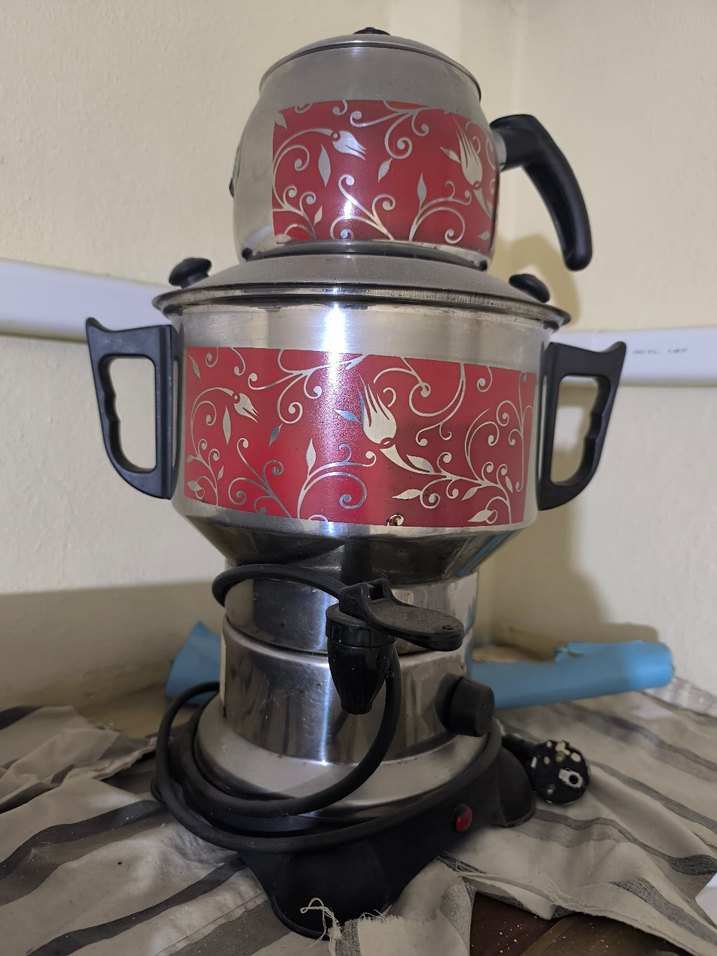 Çiçek desenli kırmızı renkli çaydanlık seti, alt demlikte iki kulp ve elektrikli taban içerir. ☕️