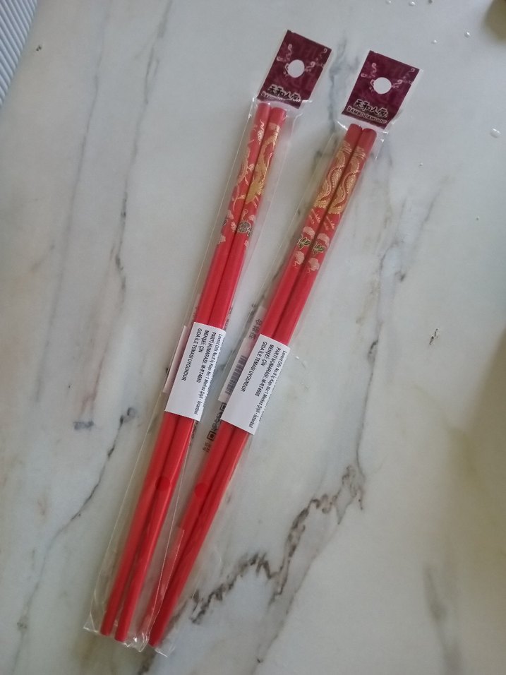 Kırmızı renkli, üst kısmında desenli ve şık görünümlü çift paketlenmiş çubuklar.