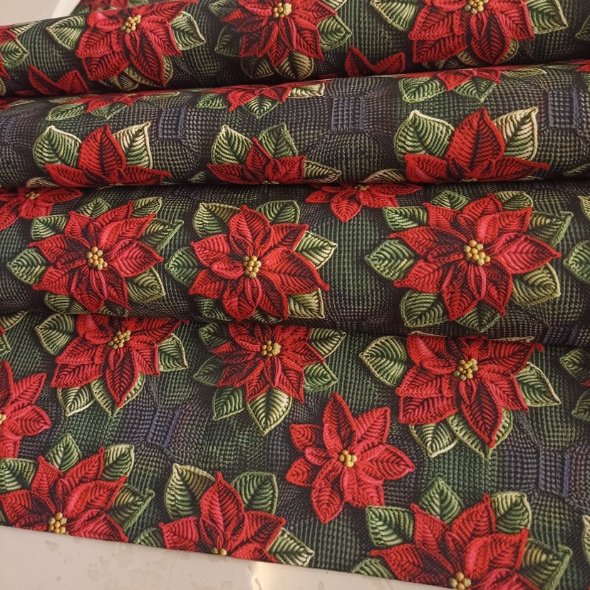 Koyu kırmızı çiçek desenli, yeşil yapraklı dokulu masa örtüsü, klasik bir görünüm sunar.