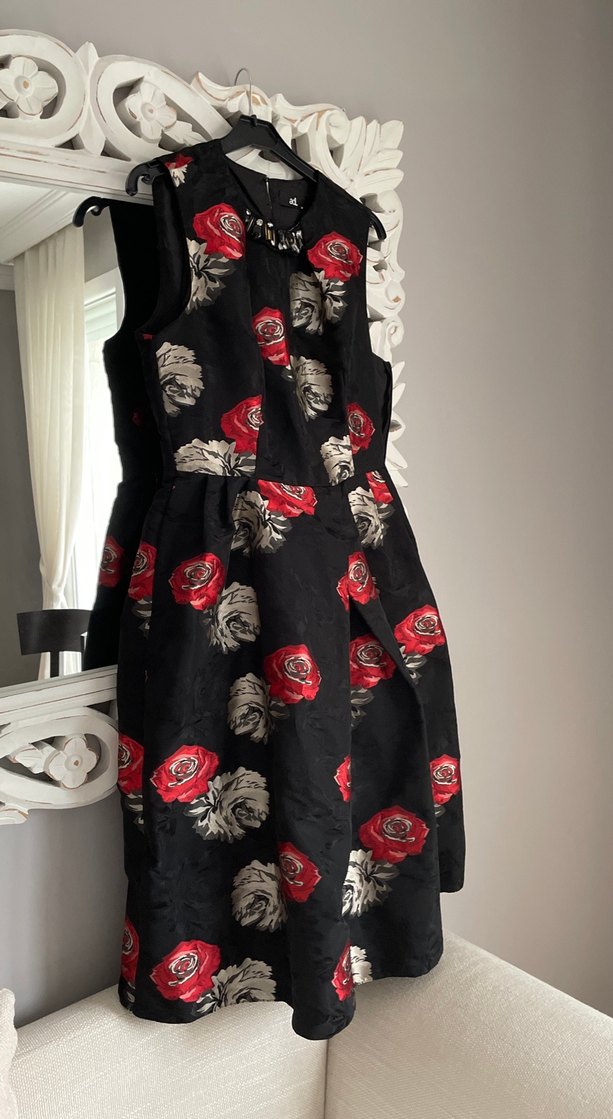 Kırmızı ve gri çiçek desenli, straplez kesim, kolsuz ve vücuda oturan uzun elbise. Vintage gotik tarzıyla romantik akşamlar için uygun.