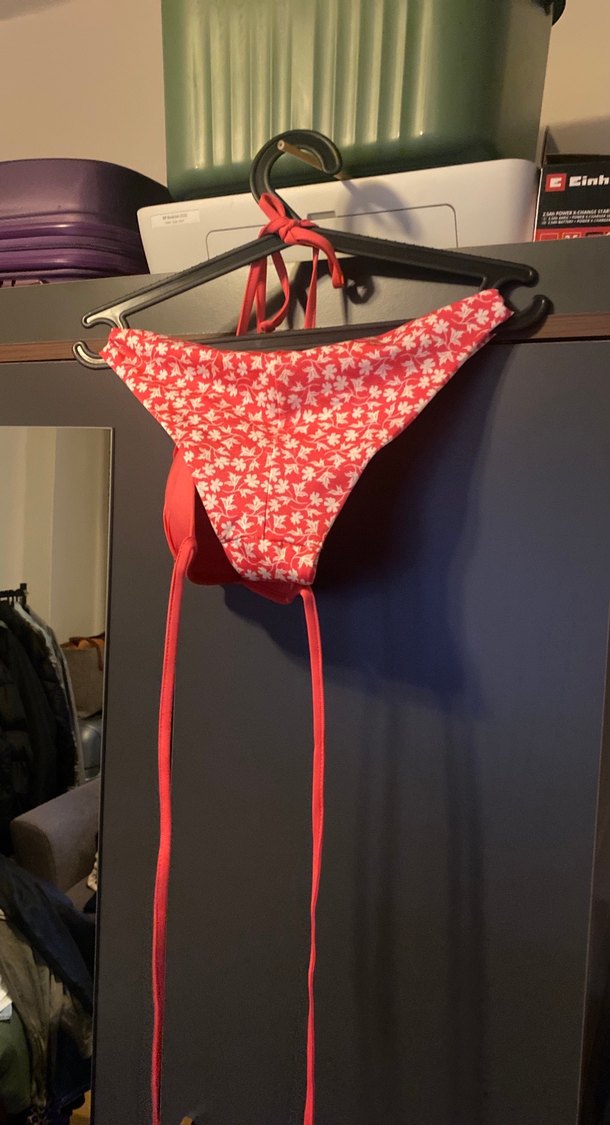 Kırmızı taban üzerine beyaz çiçek desenli, ayarlanabilir bantlı, vücuda oturan bikini altıdır. Plaj için uygundur.