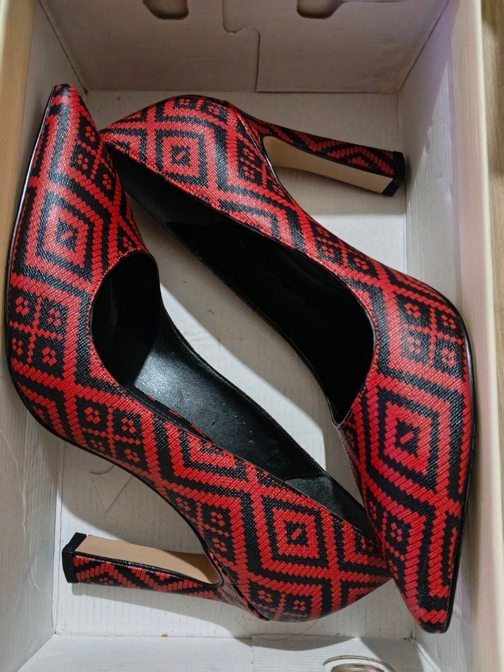 Kare desenli, tokalı kırmızı kadın topuklu ayakkabılar. Blok topuklu ve kauçuk malzemeden, cesur avant-garde tarzı yansıtıyor.