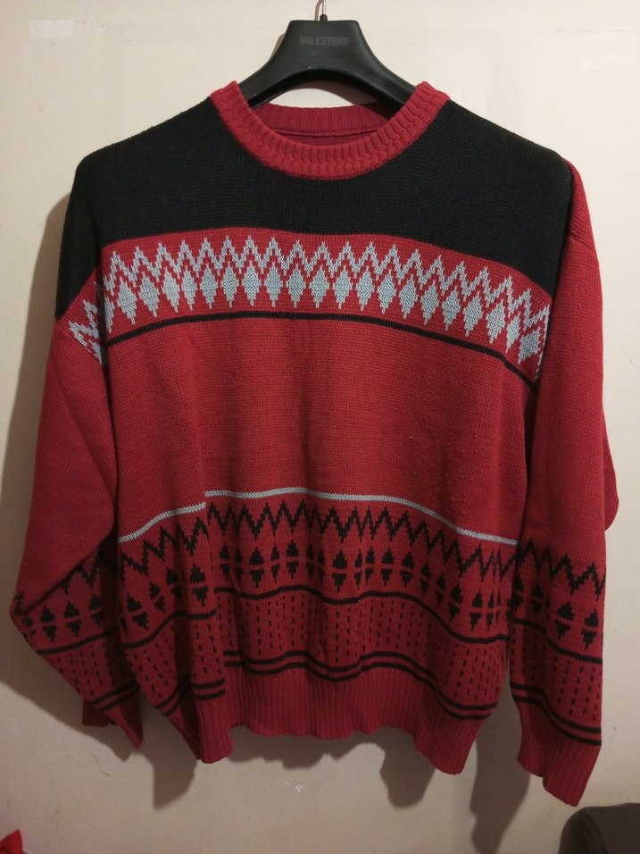 Kırmızı, desenli triko erkek kazak, yuvarlak yaka ve uzun kollu. Bol kesim, rahat ve retro tarzıyla günlük kullanım için uygun. L/XL bedene uygun.