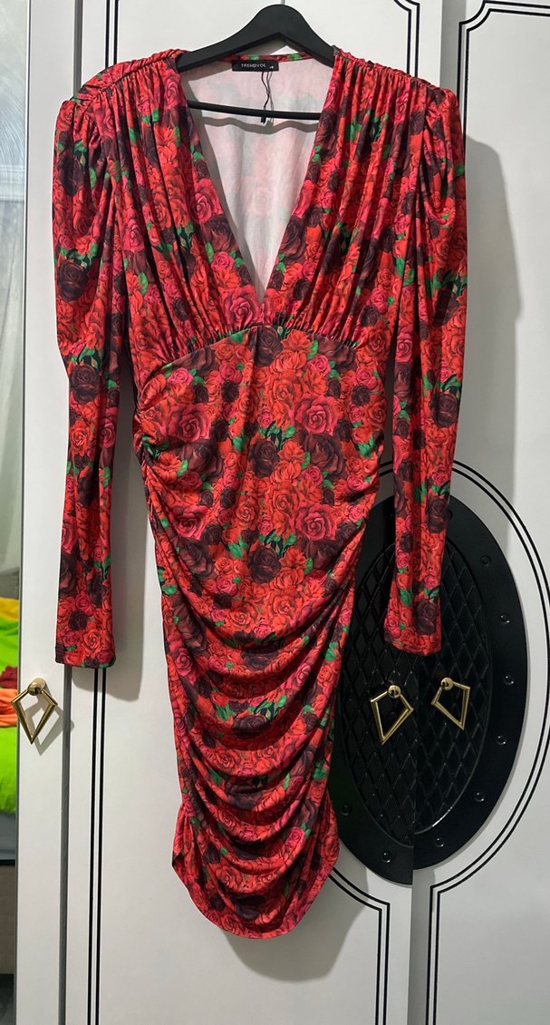 Kırmızı çiçek desenli, uzun kollu, derin V yakalı ve drapeli, bohem tarzda, romantik akşamlar için uygun uzun elbise.