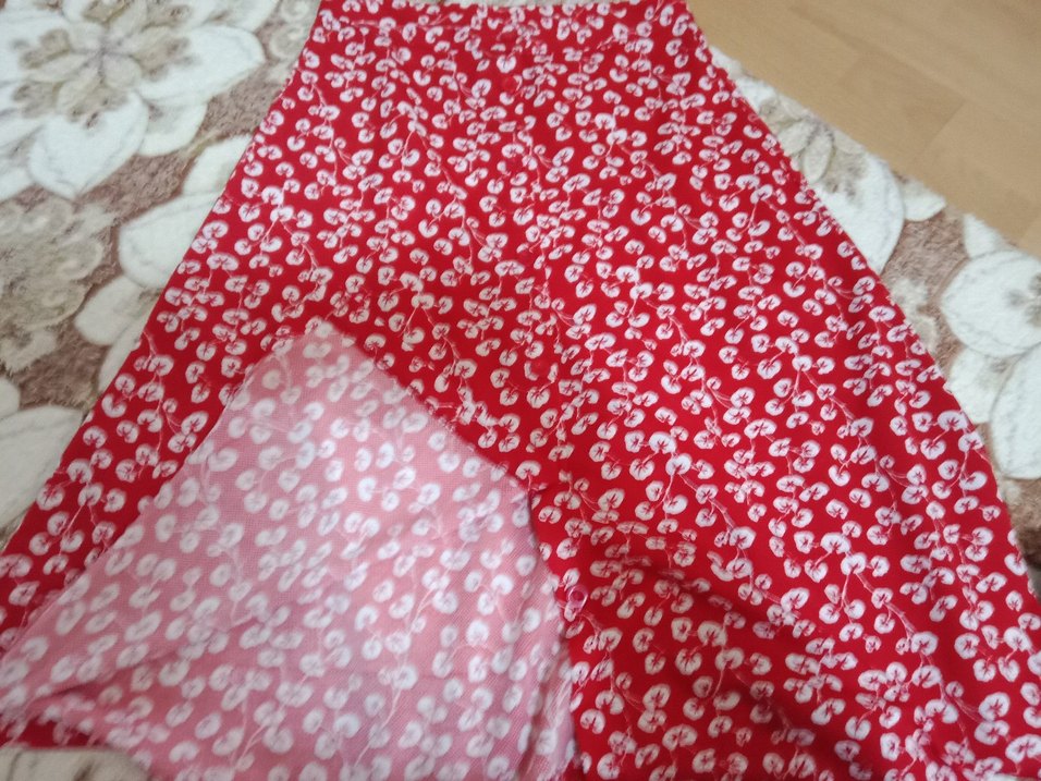 Renkli kırmızı desenli, volan detaylı, uzun hamile eteği. Yumuşak sentetik kumaştan, bohem ve retro tarzda günlük kullanım için uygun.