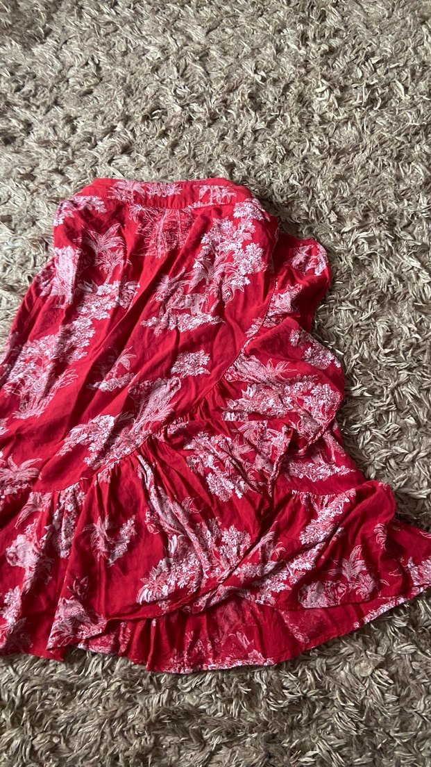Kırmızı, desenli tekstil kumaştan, bol kesim ve fırfır detaylı uzun hamile eteği. Bohem tarzı yansıtır, günlük kullanıma uygundur.