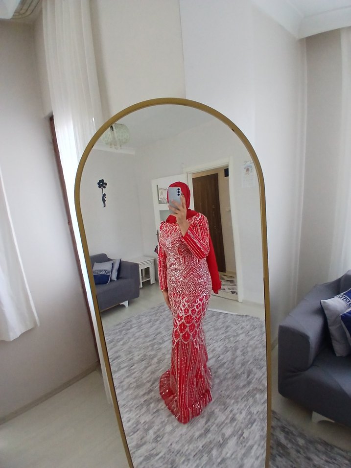 Kırmızı, desenli, uzun kollu ve tekne yaka bohem tarzda, düğün için uygun, drapeli, vücuda oturan uzun elbise. 42 bedene kadar uyumlu şalıyla birlikte kiralık giy gönder satılık 4500 tl