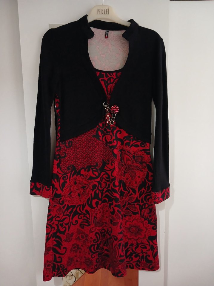 Koyu kırmızı desenli, uzun kollu ve V yakalı, vücuda oturan Örme kumaşıyla dokulu, romantik akşamlar için uygun.