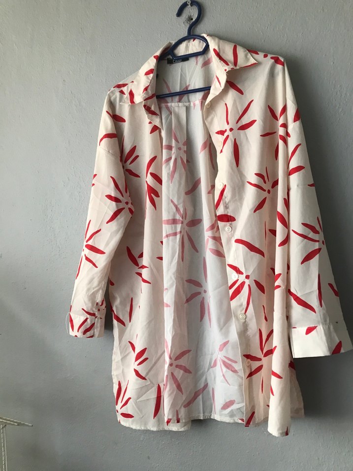 Keten kumaştan, uzun kollu ve düğmeli, notalı yaka detaylı bol kesim tunik. Hafif kırmızı baskılı, bohem tarzda günlük kullanım için uygundur.