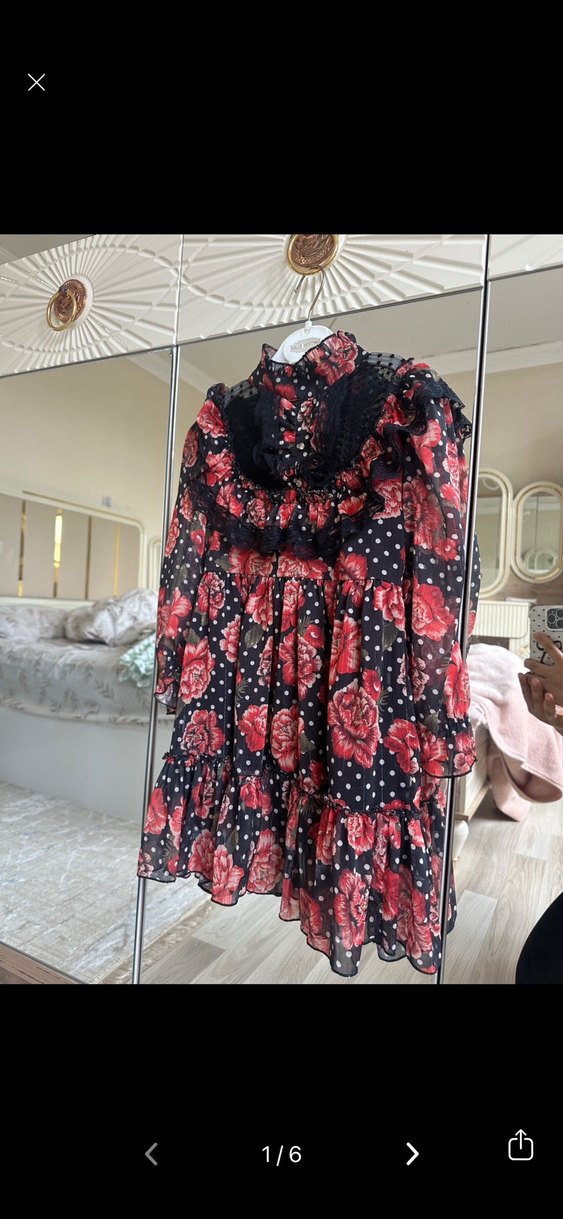Yüksek yakalı, uzun kollu ve bol kesim kız elbisesi. Koyu kırmızı desenli kumaş ve fırfır detaylarıyla gotik ve bohem tarzı bir arada sunuyor.