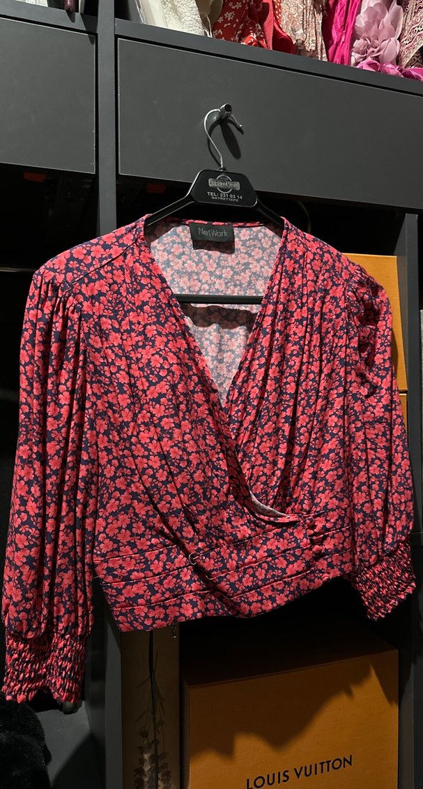 Kırmızı tonlarında karışık desenli, uzun kollu ve V yakalı kadın bluz. Bol kesim, midi boy ve dökümlü ön tasarıma sahip, sentetik kumaştan üretilmiştir.