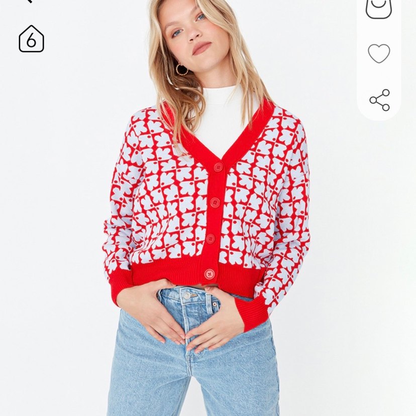 desenli, kırmızı açık tonlarda örgü hırka. V yaka, uzun kollu. Günlük kullanıma uygun.