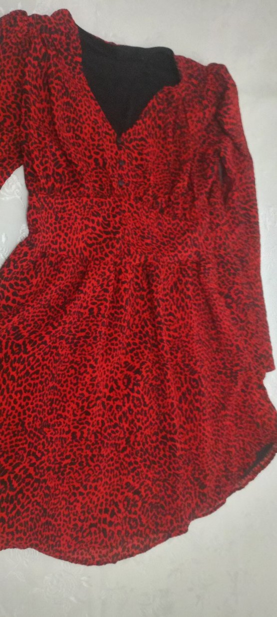 Kırmızı midi elbise, V yaka, uzun kollu ve fırfırlı detaylara sahiptir. Salaş kesim ve desenli tasarımıyla romantik akşamlar için uygundur. ❤️ Deformesi yoktur sadece yaka kısmındaki etiketini kestiğim için delik vardı o delikleri diktim sadece bir iki kere giydim