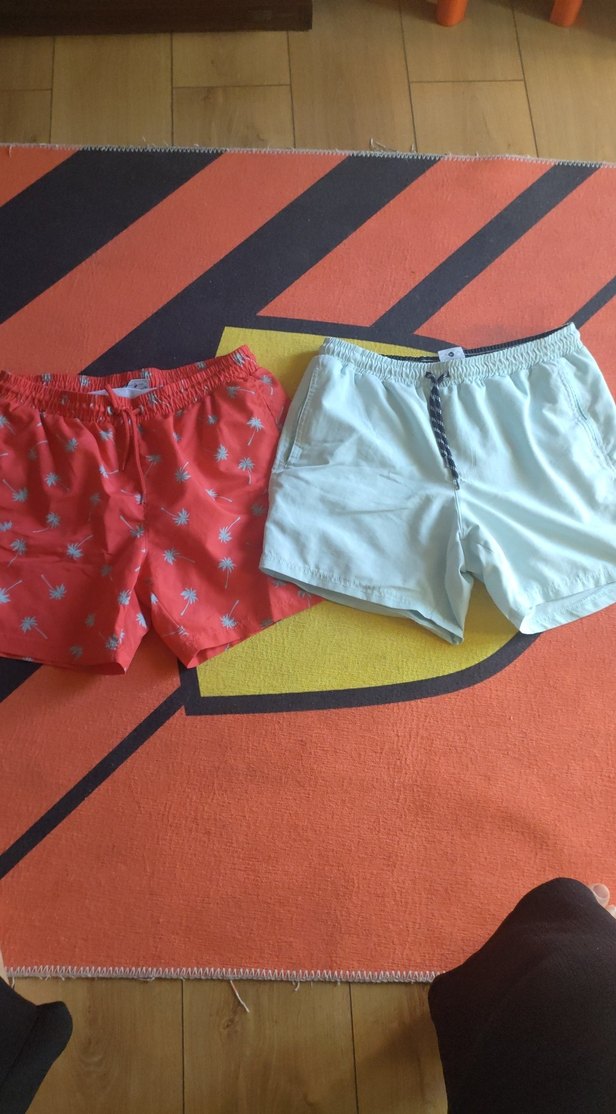 Canlı kırmızı palmiyeli desenli ve sade beyaz mini erkek mayo, rahat kesimiyle plajda şık ve sportif görünüme uygundur. ikiside m bedenlidir olmadığı için satıyorum sorunsuzdur LCW markalıdir