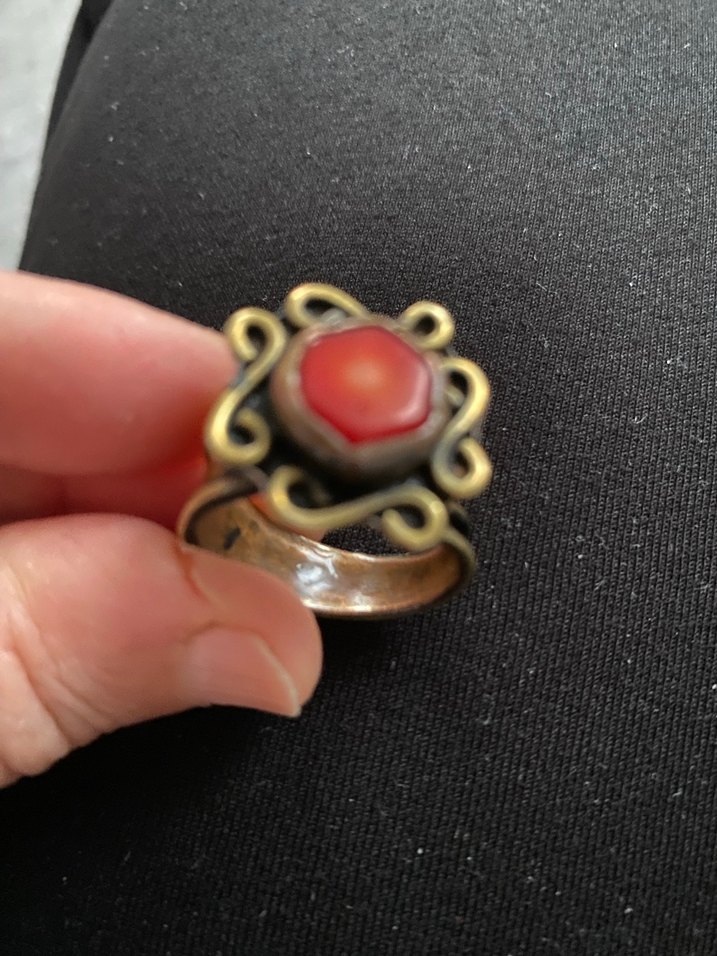 Düğmeli, desenli kırmızı taşlı, renkli vintage tarzı kadın yüzüğü. Düğünler için uygun klasik tasarım.