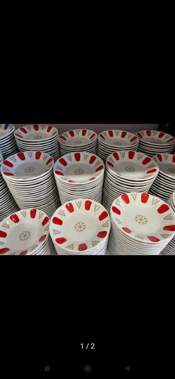 Kenarlarında koyu kırmızı desen ve ortasında dekoratif detay bulunan yuvarlak beyaz tabaklar. ️