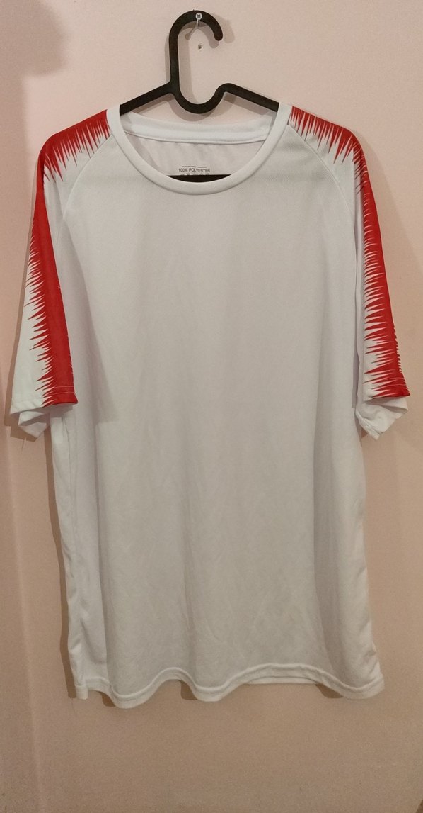 Kısa kollu, kırmızı baskılı detaylara sahip beyaz erkek spor tişörtü. sentetik kumaştan üretilmiştir. ⚽ marka temsilidir.
