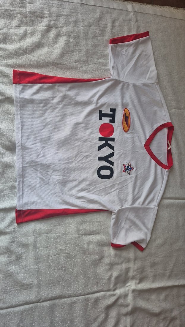 Kısa kollu, bisiklet yaka ve cırt cırtlı detaylı, beyaz ve kırmızı renklerde, sentetik kumaştan yapılmış bir tişört.