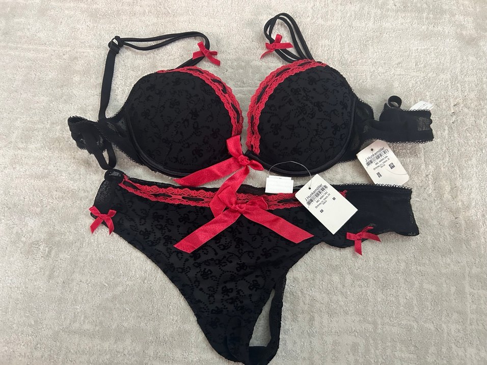 kadın iç çamaşırı.iki parça . yeni . ithal Almanya'dan satın alındı ,Gotik tarzda, siyah desenli kumaş üzerine kırmızı dantel ve fiyonk detayları bulunan Parisian esintili sütyen takımı. Sütyen beden EU75B. F90B Külot beden M