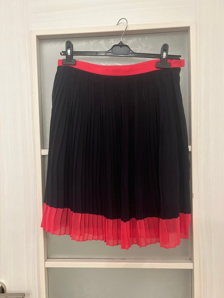 Bu midi etek, bel ve etek ucu kırmızı bantlı siyah piliseli detaylara sahip, rahat kesimiyle şık bir ofis görünümü sunar.