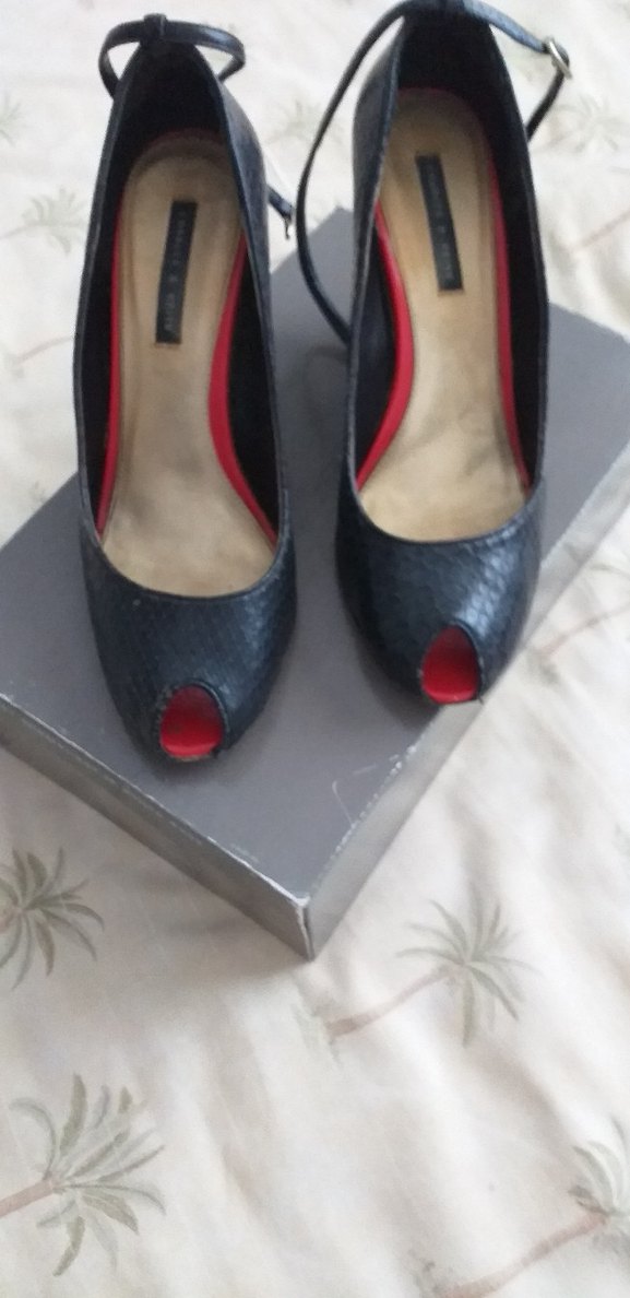 Kırmızı iç detaylı, siyah yılan derisi desenli stiletto topuklu ayakkabılar. Önü açık ve bilekten bağlamalı. dolgu topuk cesur ve çağdaş tarz için uygun.