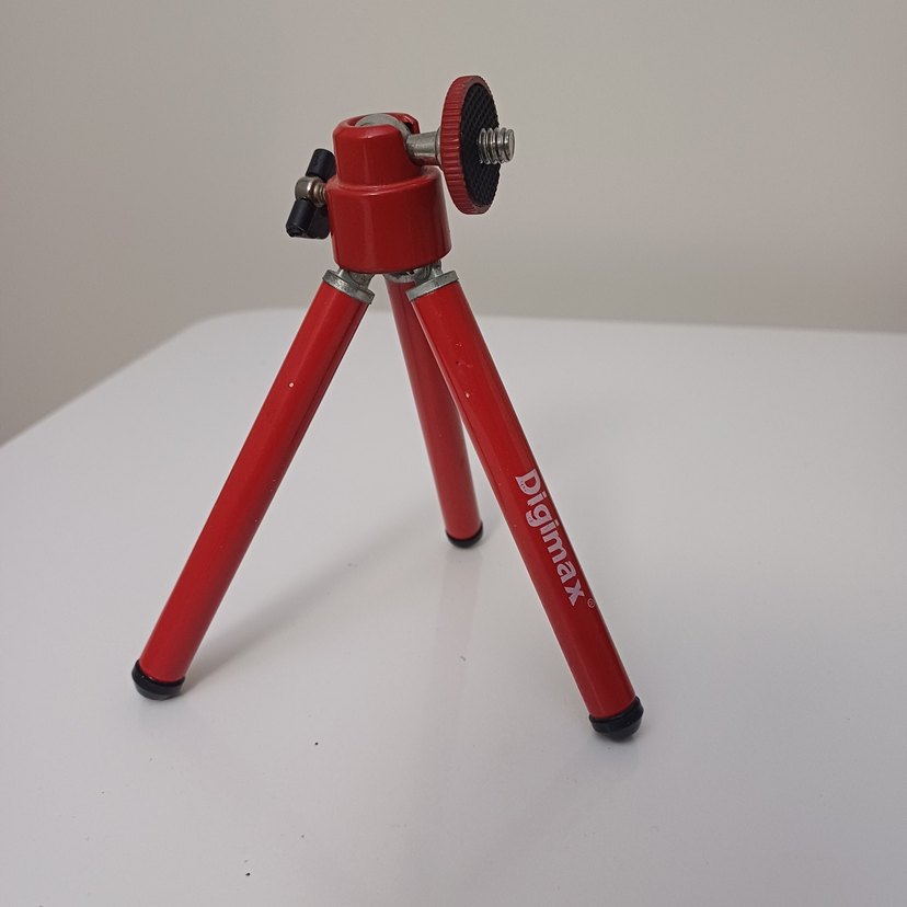Kırmızı Digimax mini tripod, ayarlanabilir ayaklarıyla kamera veya telefonlar için sağlam destek sağlar. Kompakt boyutuyla taşınması kolaydır.