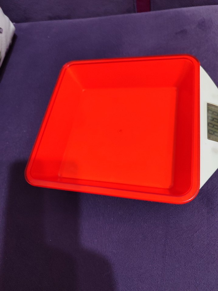 Canlı kırmızı tartım haznesi ve net ekranı olan dijital mutfak tartısı. Hassas ölçümler için uygundur. pil kapağı yoktur