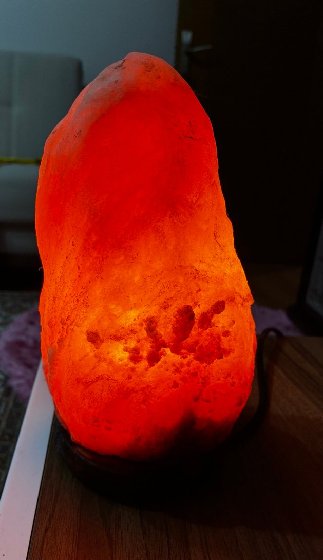 Kırmızı renkli doğal kaya tuzu tasarımlı lamba, ahşap taban üzerinde sıcak ve renkli bir ortam sağlar. ️