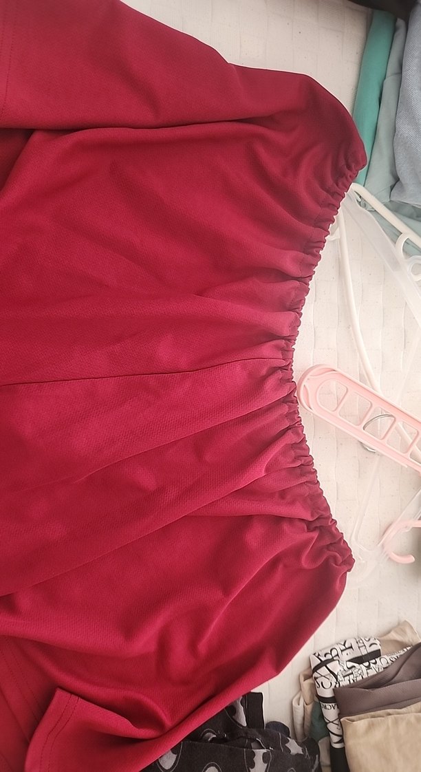 Kırmızı dökümlü hamile midi etek, parlak sentetik kumaştan, bol kesim ve minimal sokak tarzıyla parti için uygun.