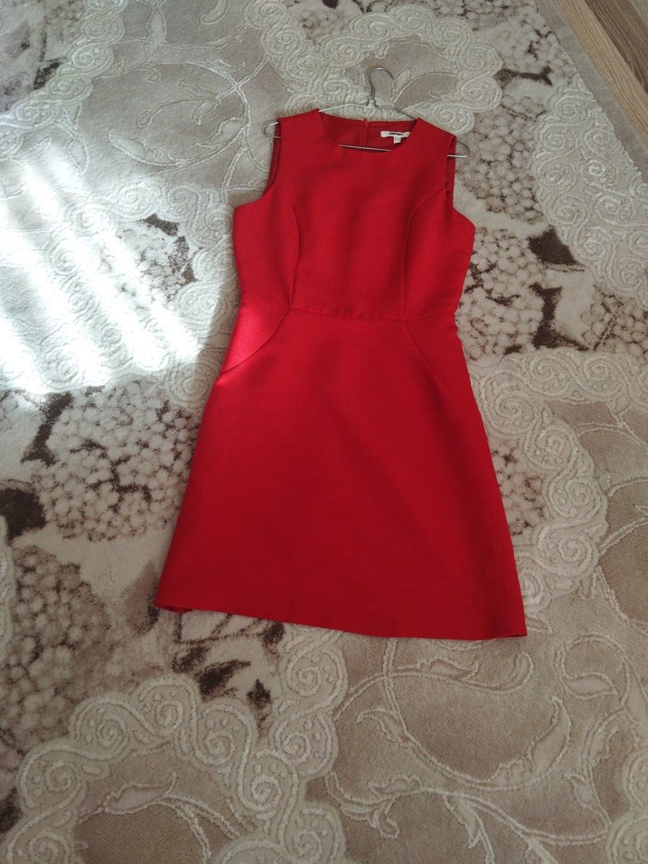 Kolsuz, kırmızı midi elbise, v yaka ve hafif drape detaylıdır. Parlak kumaşıyla modern klasik ve minimal şıklığı bir araya getirir. ölçüleri omuz 33 cm göğüs 44,5 cm bel 37 cm basen 47 cm boydan 92 cm