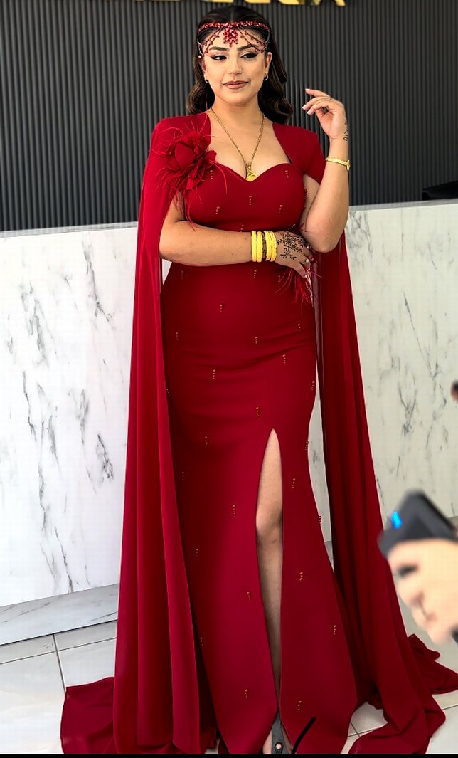 Kırmızı renkli, V yaka ve kolsuz, drape detaylı, desenli ve önü yırtmaçlı uzun abiye elbise. Düğünler için uygun. ✨