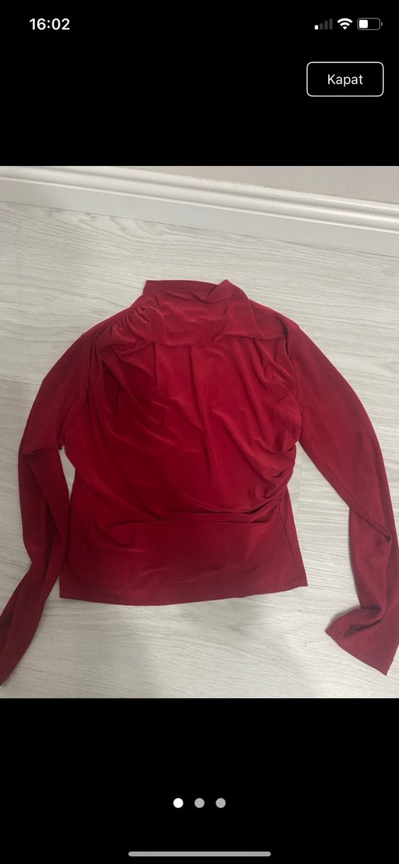 Kırmızı, balıkçı yaka ve uzun kollu, drapeli tasarıma sahip, vücuda oturan kadın bluz. Yumuşak sentetik kumaştan, normal midi boyda, dış mekan sokak stiline uygun.