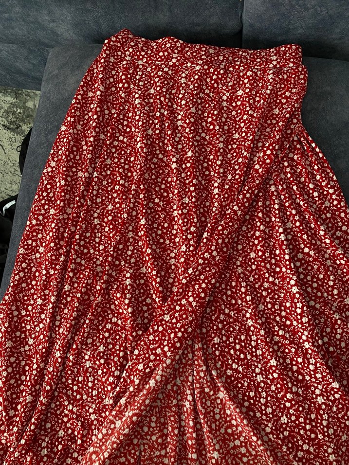 Kırmızı parlak sentetik kumaştan, drapeli ve uzun kesim bohem tarzda, dış mekan kullanımı için uygun, vücuda oturan kadın midi eteği.