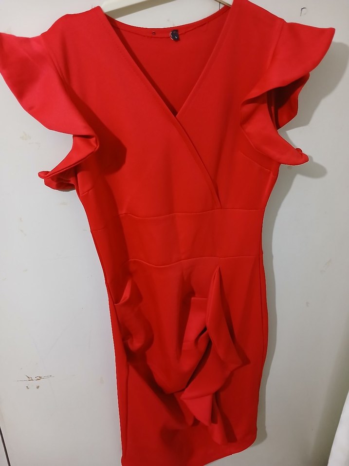Cesur kırmızı renkte, V yakalı ve kolsuz, drapeli detaylara sahip midi boy, vücuda oturan kadın abiye elbisesi. Parti için uygun, çağdaş ve avangart tarzda.