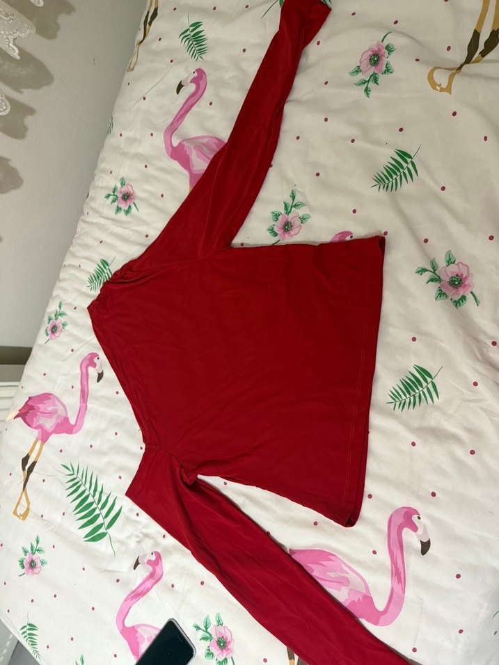 Uzun kollu, kayık yaka ve drapeli detaylı kırmızı hamile bluzu. Normal midi boyda, yumuşak sentetik kumaştan yapılmıştır. Günlük kullanım için uygundur.