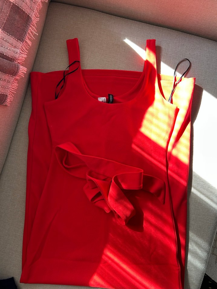 Kırmızı, drapeli ve askılı hamile elbisesi, satenimsi kumaştan üretilmiş, kolsuz ve midi boydadır. Günlük kullanım için uygundur.