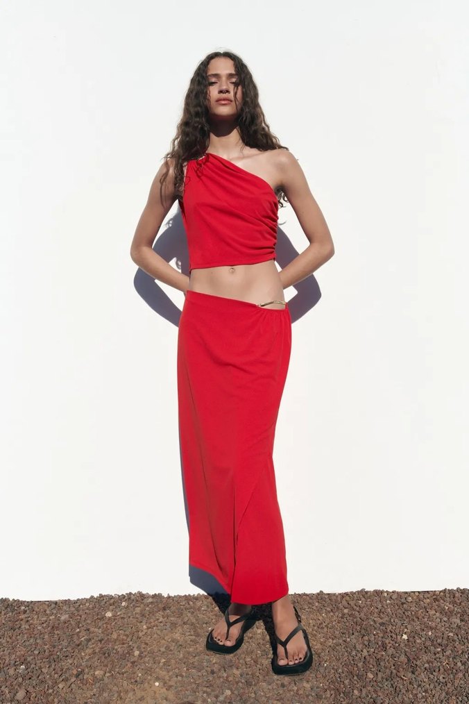 Canlı kırmızı sentetik kumaştan, drapeli ve straplez tasarımlı, uzun ve vücuda oturan iki parçalı takım buradan aldım uzun süre giyecek bir yerim olmayacağı için satmaya karar verdim üst small beden alt medium beden zincirleri isteğe göre değiştirilebilir