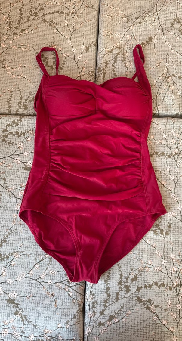 İnce askılı, drapeli kırmızı mayo, cesur ve göz alıcı bir plaj görünümü sunar. ve desensiz kumaştan yapılmıştır.