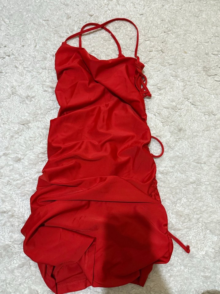 Parlak kırmızı renkte, ince askılı ve halter yaka uzun kadın abiyesi. Drapeli ve dar kesimiyle cesur bir parti görünümü sunar. Streetwear ve athleisure tarzı harmanı.