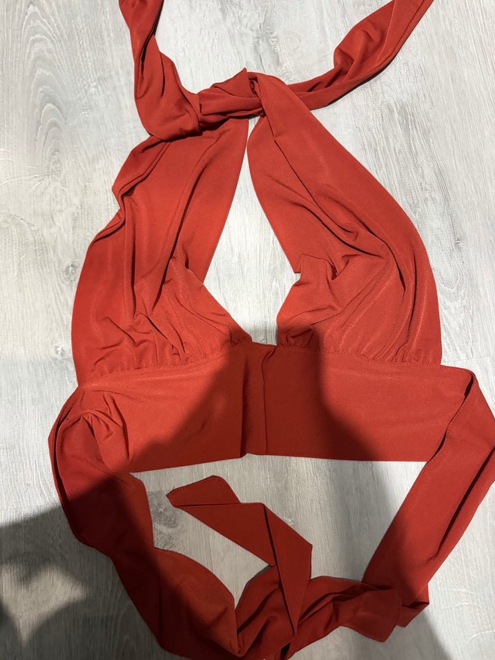 Kırmızı, drapeli ve ince askılı uzun kadın büstiyer, şık ve parlak tasarımıyla açık hava kullanımı için uygundur.