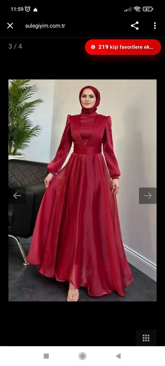 Koyu kırmızı renkli, uzun ve drapeli tasarıma sahip elbise. Hakim yakalı, pöğüs altından oturtmalı parlak, rahat ve çok şık bir elbisedir. Kardeşimin düğünü için almıştım. İki defa giydim. yepyeni duruyor.