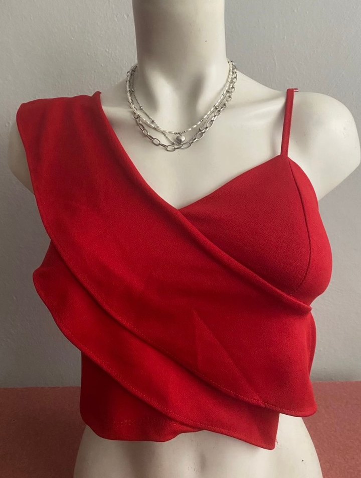 Parlak kırmızı renkte, drapeli kadın body chain. Cesur sokak stili için uygun, desensiz ve günlük kullanıma uygun.