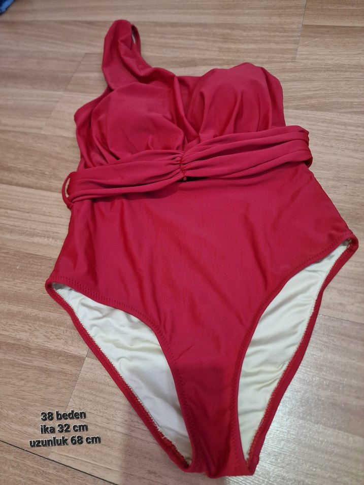 Kırmızı, drapeli ve askılı kadın mayo. 38 beden, 68 cm uzunluk ve 32 cm göğüs genişliğine sahiptir. Midi boyda, plaj için uygundur.