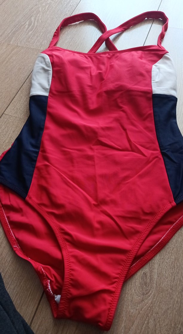 Koyu kırmızı renkte, drapeli ve askılı tasarıma sahip, yanları kontrast renkli, vücuda oturan kadın mayosu. ️