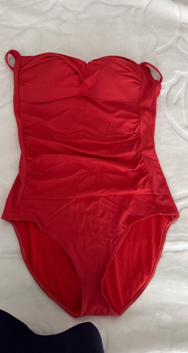 Kırmızı, drapeli ve kolu olmayan bu kadın mayosu, parlak bir görünüme ve modern bir tarza sahiptir. Plaj için uygundur.