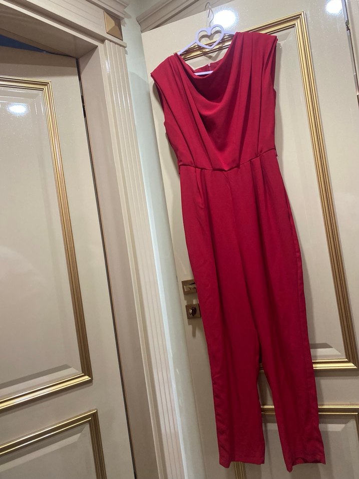 Uzun, fitted kesim kadın tulum, kolsuz ve drapeli V yakaya sahiptir. İpeksi kumaştan yapılmış, parlak kırmızı renkte, minimalist ve çağdaş tarzda, ofis kullanımı için uygun.