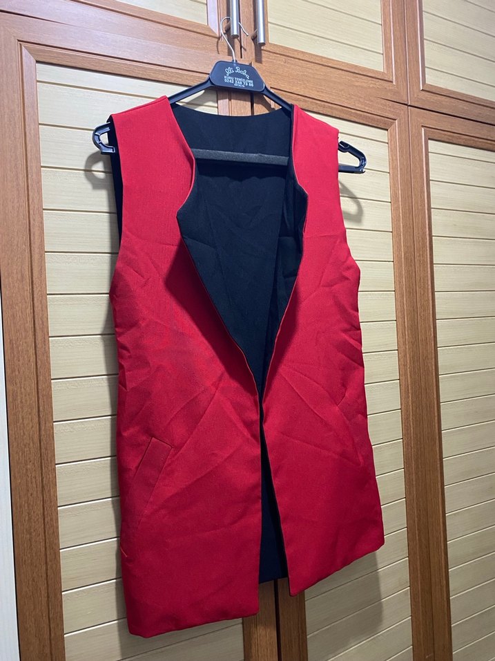 Kırmızı renkli, drapeli ve yakalı kolsuz kadın yelek. Sentetik kumaştan, normal kesim ve midi boyda, minimalist sokak stili için uygun.hiç giyilmedi