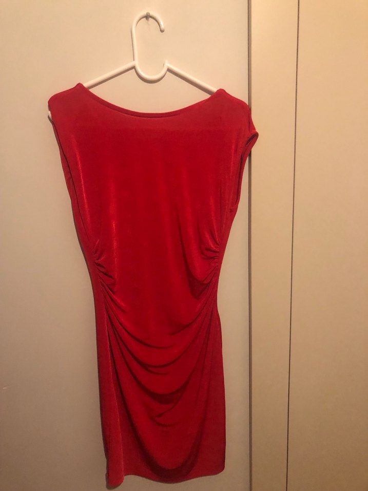 Kırmızı, drapeli tasarıma sahip arkası V yaka midi elbise. Fitted kesimi ve parlak dokusu vardır. Hafif simli görüntülüdür. Kotonundur