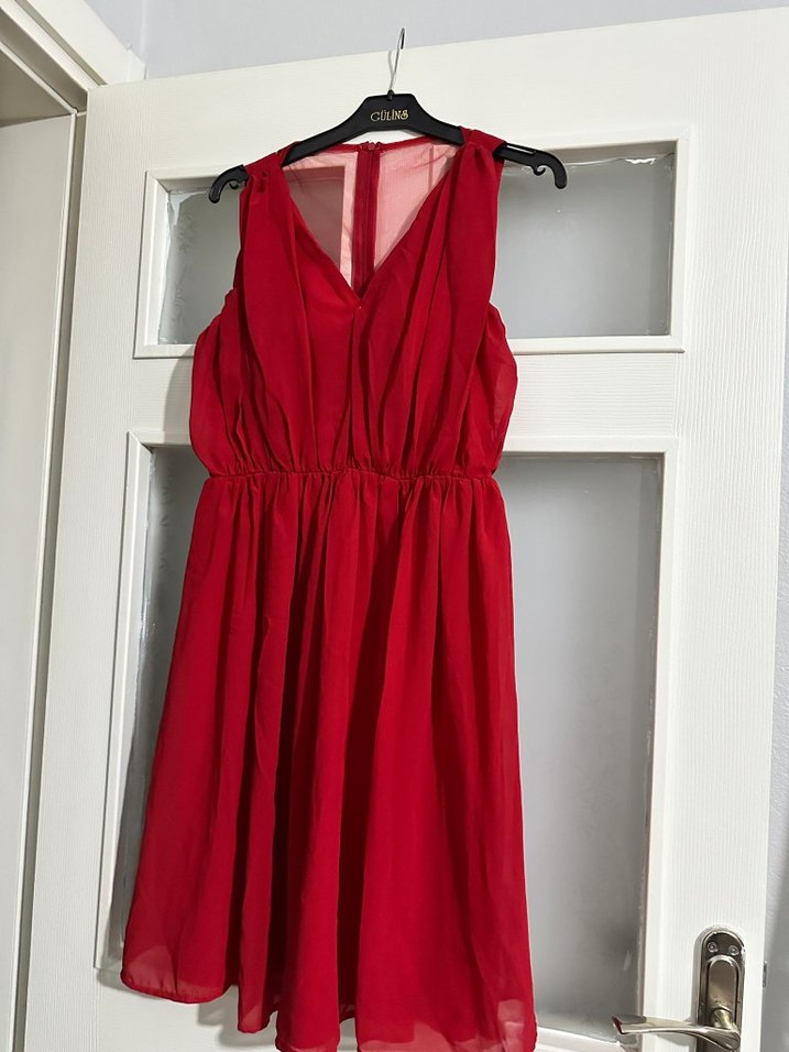 Parlak kırmızı renkte, drapeli ve beli oturan V yakalı midi abiye elbise. Kolsuz ve modern klasik tarzda, Paris etkisiyle romantik akşamlar için ideal. ❤️
